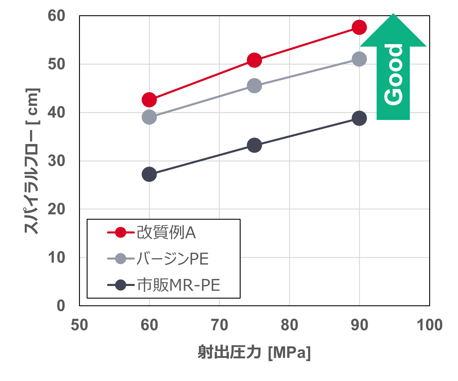 射出成形性の向上を目的に改質を実施し、MFRが23 g/10minで、密度が0.93 g/cm³の材料を開発しました。射出成形のしやすさの指標であるスパイラルフローを測定した結果、改質例AではMFRが20 g/10minのバージンPEを上回る成形性を示しました。これにより、元のMR-PEから流動性を大幅に向上させ、射出成形に適した高性能材料へと改質させることに成功しています。なお、MR-PE配合比率は30 wt%となっています。