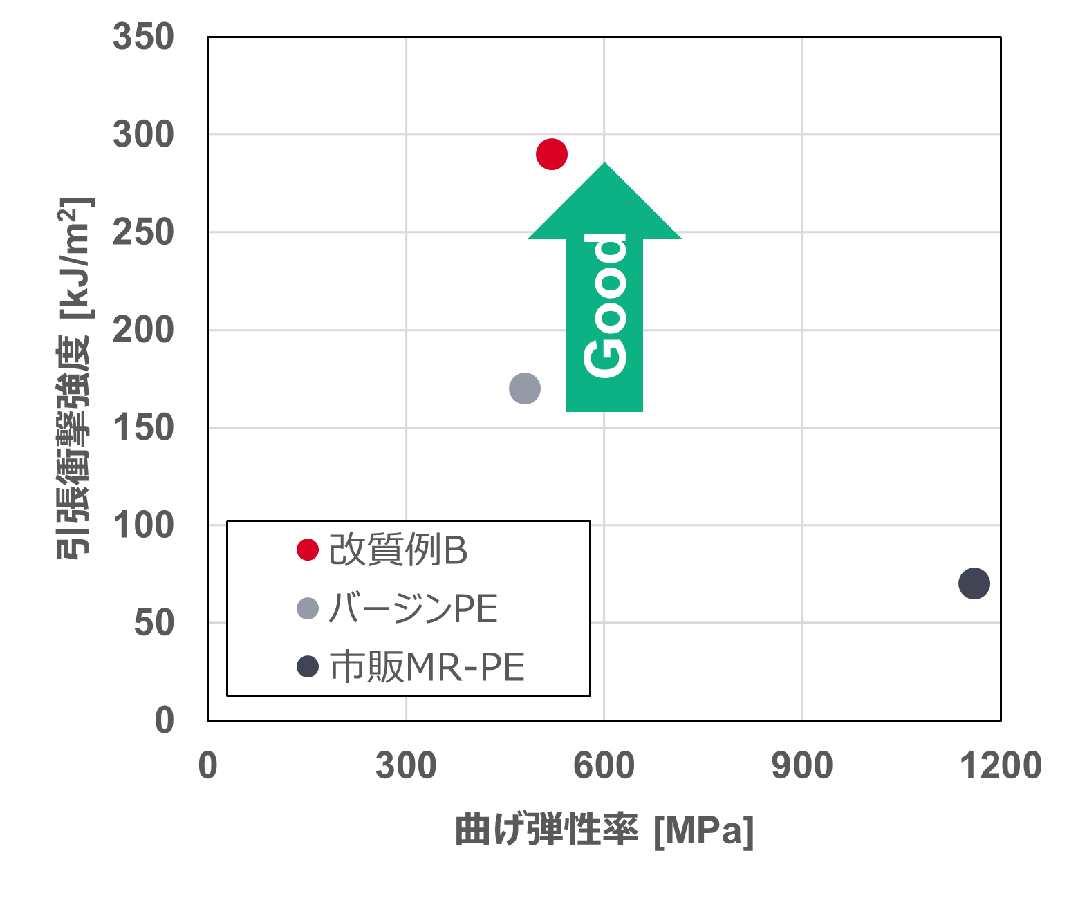 耐衝撃性の向上を目的に改質を実施し、MFRが5 g/10minで、密度が0.94 g/cm³のブレンド材料を開発しました。類似のMFR・密度を持つバージンPEと比較して、同等の硬さを保ちながら、より高い衝撃強度を実現しています。これにより、MR-PEを衝撃に強い高性能材料へ改質させることができました。なお、MR-PE配合比率は50 wt%となっています。