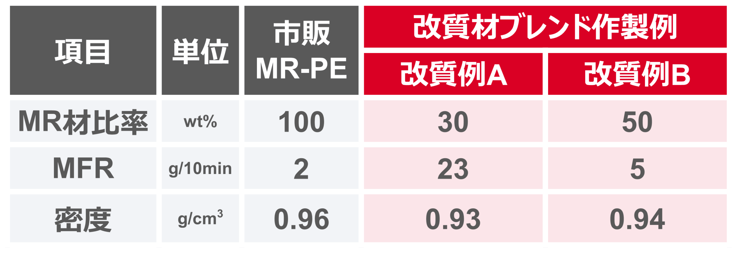 日本ポリエチレンは多様な用途向けの製品ラインナップと豊富な知見を活かし、用途ごとに最適な配合設計を行い、MR-PEを効果的に改質しています。