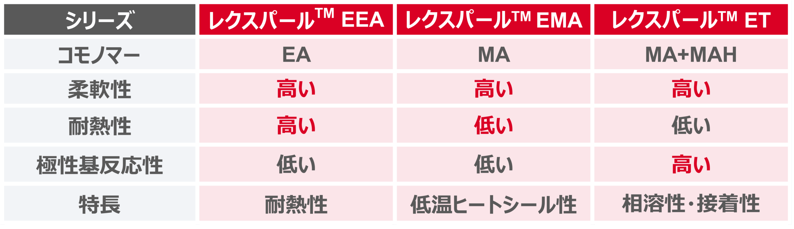 レクスパール™はコモノマーの構成によって EEA(エチルアクリレート:EA)、EMA(メチルアクリレート:MA)、ET(MA+MAH) の3つのシリーズがあり、いずれもポリエチレン系樹脂の柔軟性を活かし、耐衝撃性の向上に寄与します。