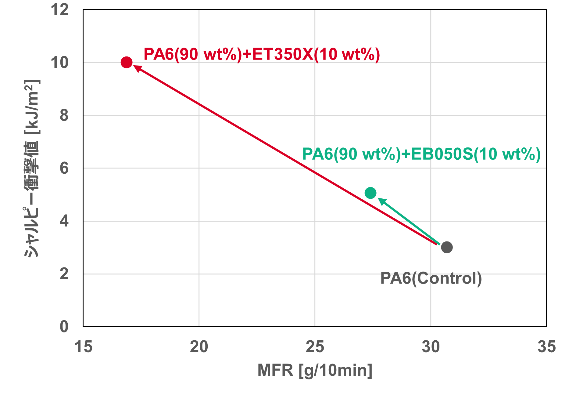 図1 レクスパール™ ETおよびEMA添加によるPA6の耐衝撃性/流動性バランス