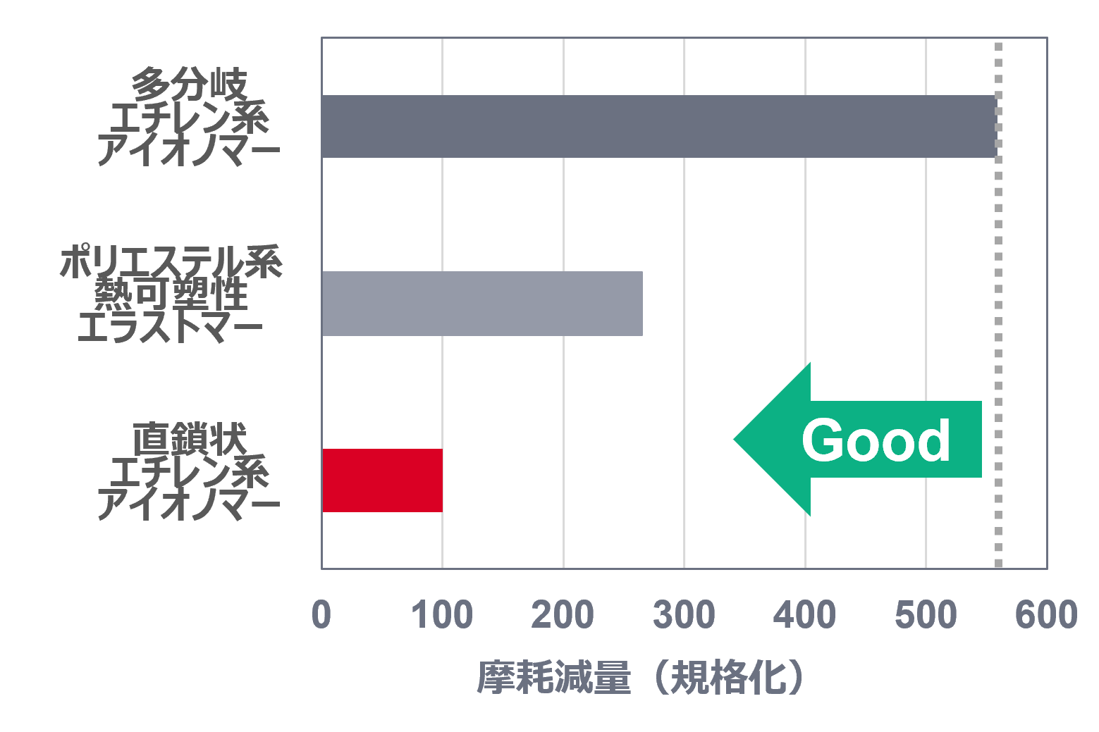 図1 各アイオノマーおよびポリエステル系熱可塑性エラストマーにおける耐摩耗性の比較