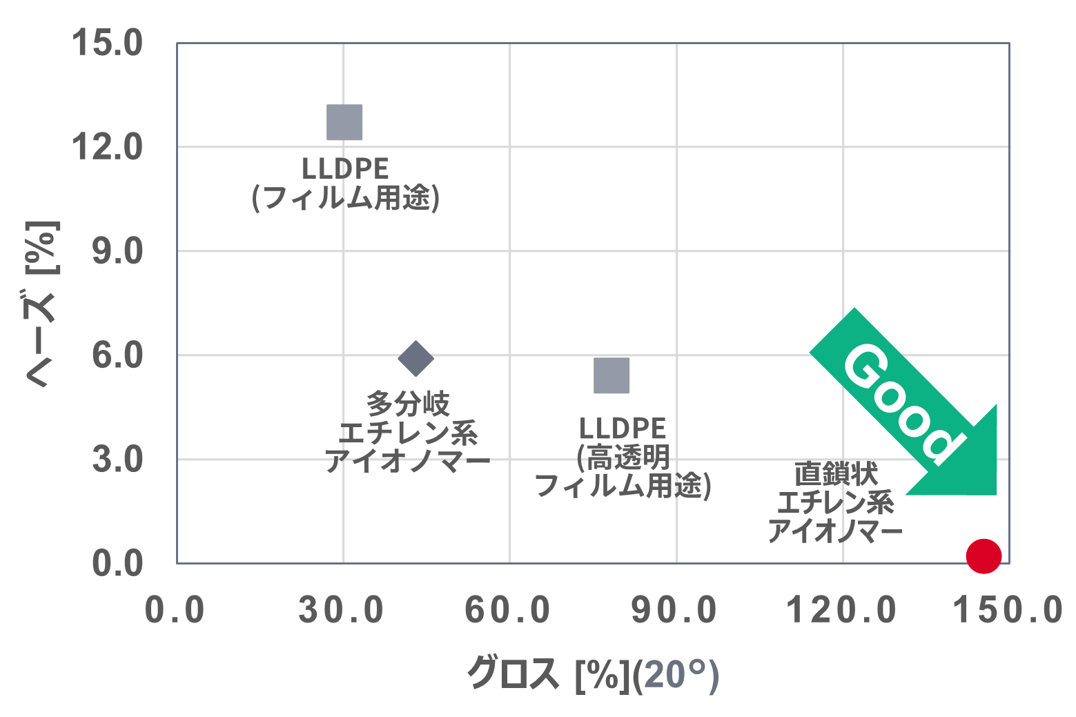 図2 各アイオノマーおよび直鎖状低密度ポリエチレン(LLDPE)におけるグロス(光沢度) vs. ヘーズ(曇り度)の比較