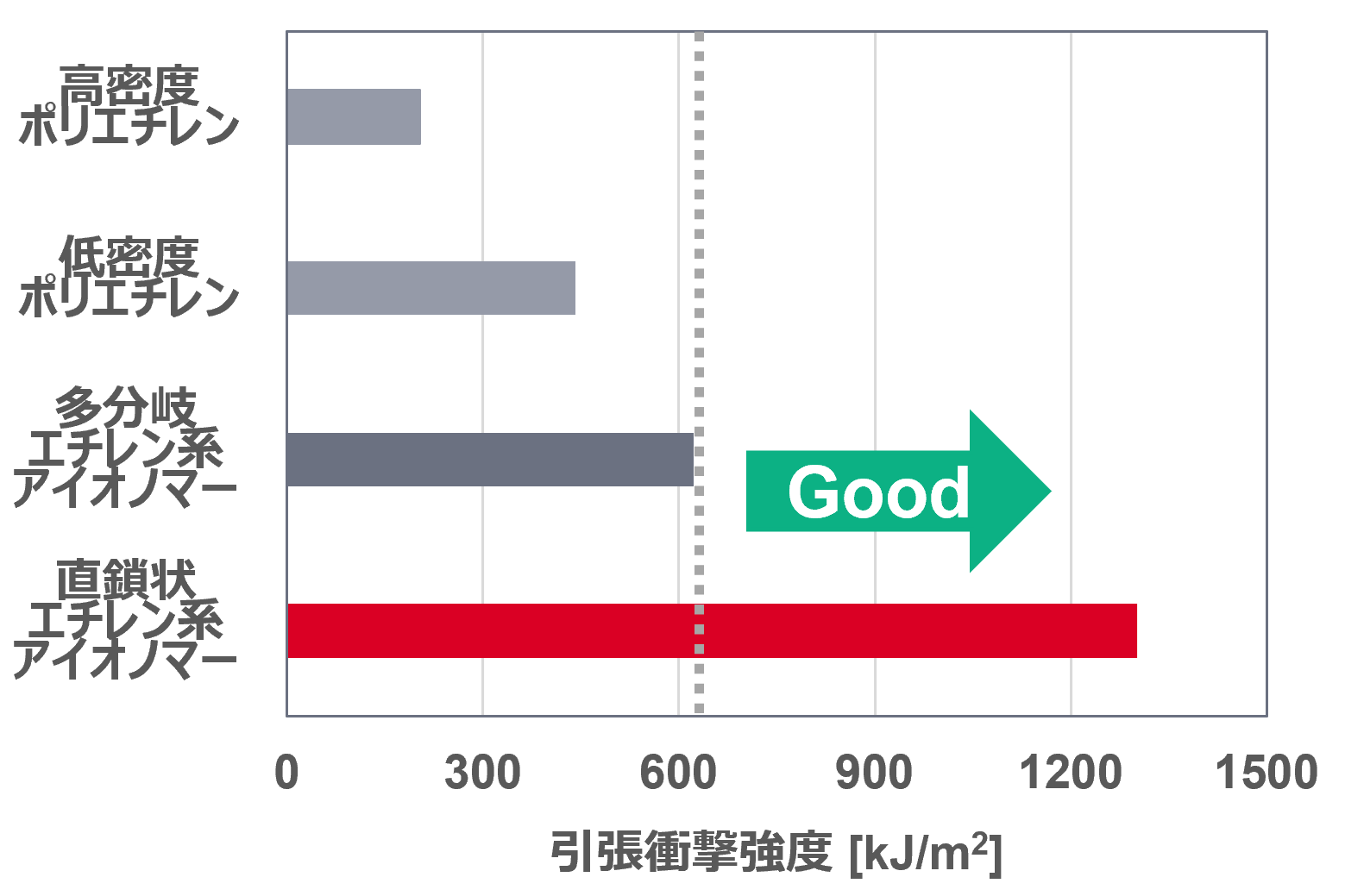 本素材は、従来の多分岐エチレン系アイオノマーとは異なる特性を示し、耐久性や機械強度が求められる用途や、従来のポリエチレンでは対応が難しかった環境下での使用を可能にしました。その物性は他の高分子材料とは一線を画しています。直鎖状エチレン系アイオノマーの概要はこちらをご覧ください。