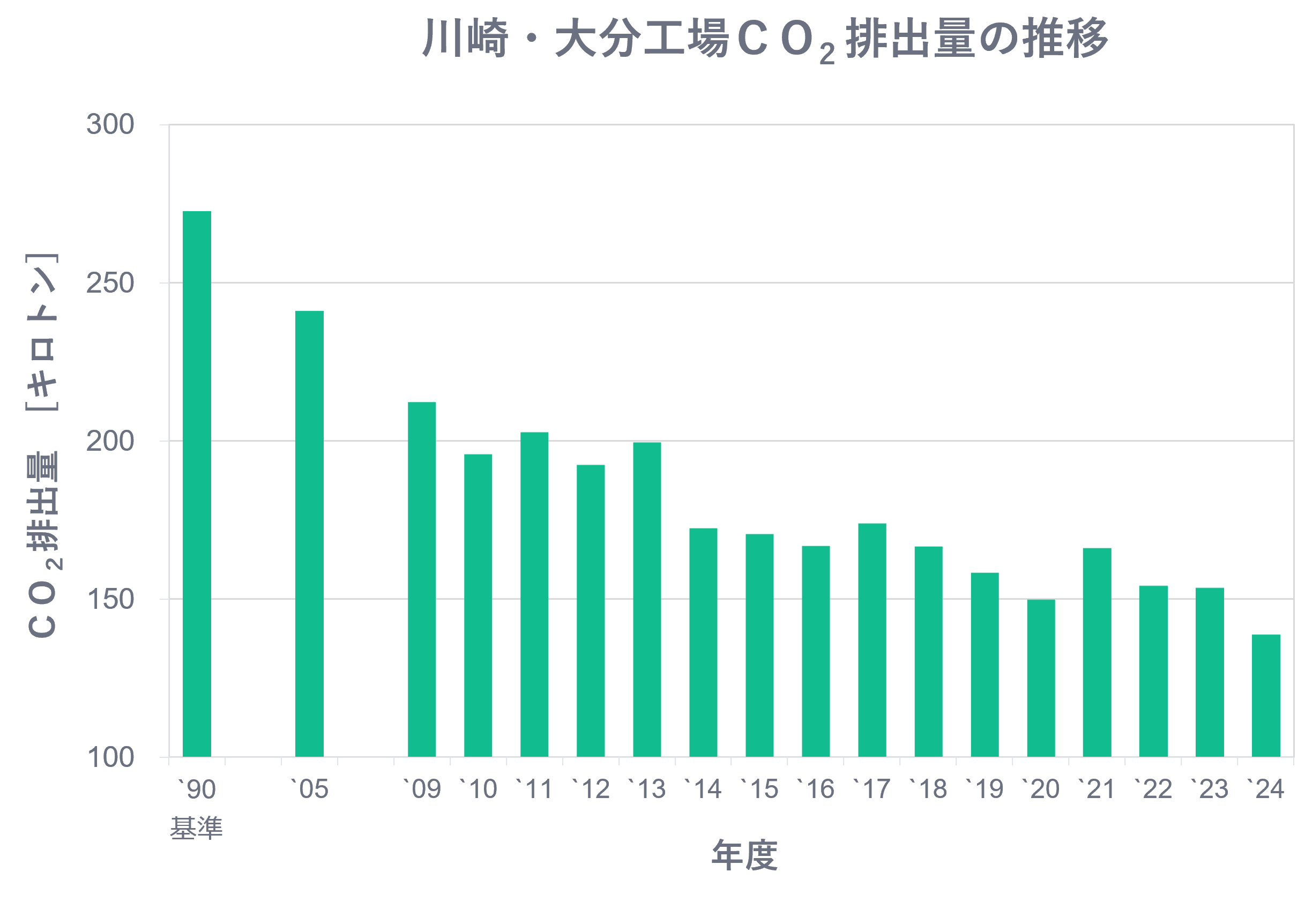 生産設備の統廃合を積極的に進めたことにより1990年比は大幅な削減が出来ました。