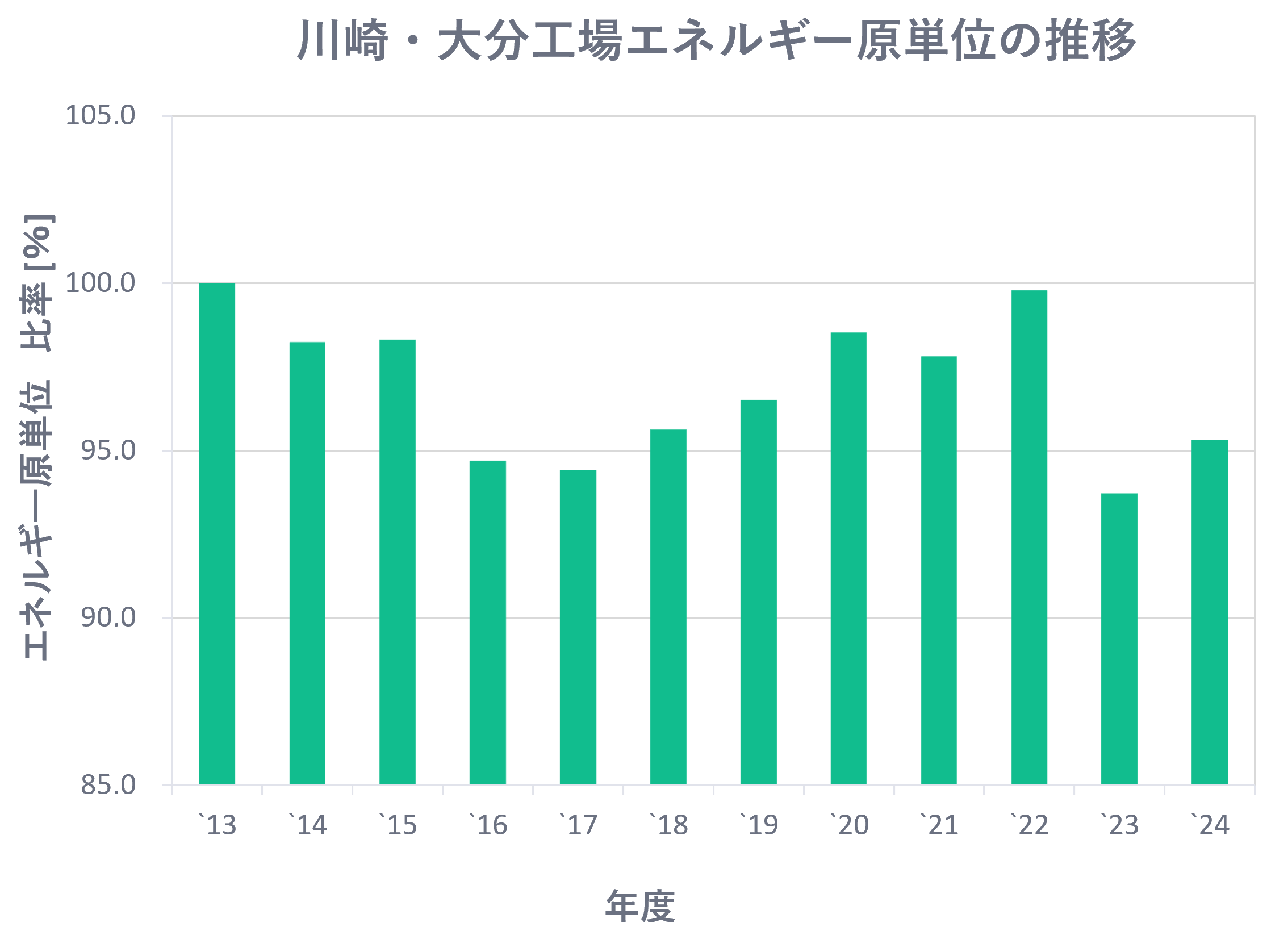 右のグラフは、日化協に報告しているエネルギー原単位の推移で、2013年を基準として新たに更なる削減に向けて引き続き活動を進めています。