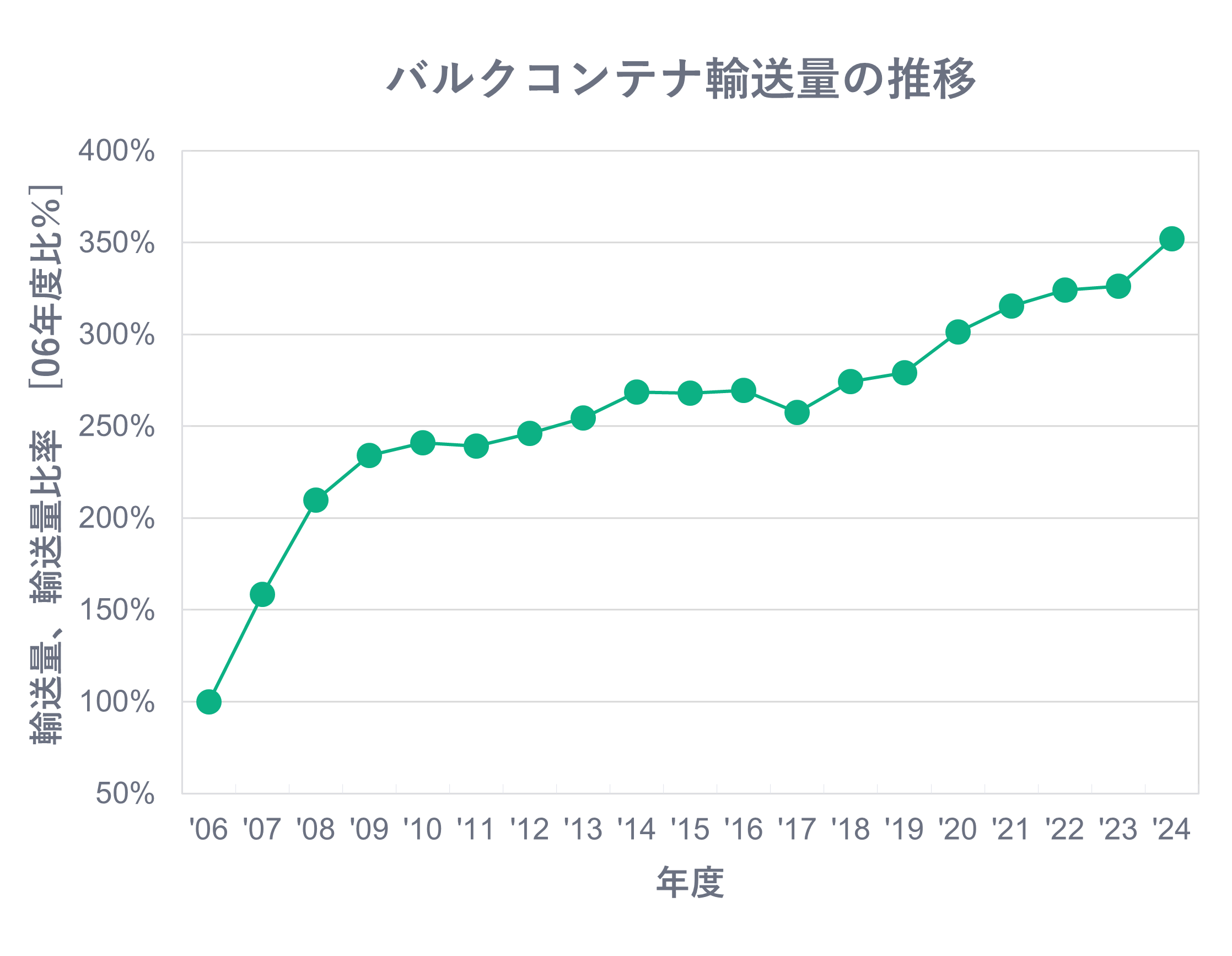 バルクコンテナは17 ton単位での輸送が可能であり、従来の1 ton入りバッグや25 kg紙袋に比べて輸送単位量を引き上げることで、CO2の削減に貢献できます。 2023年度のバルクコンテナ輸送量は、2006年度比約3.5倍で、CO2削減に寄与しております。