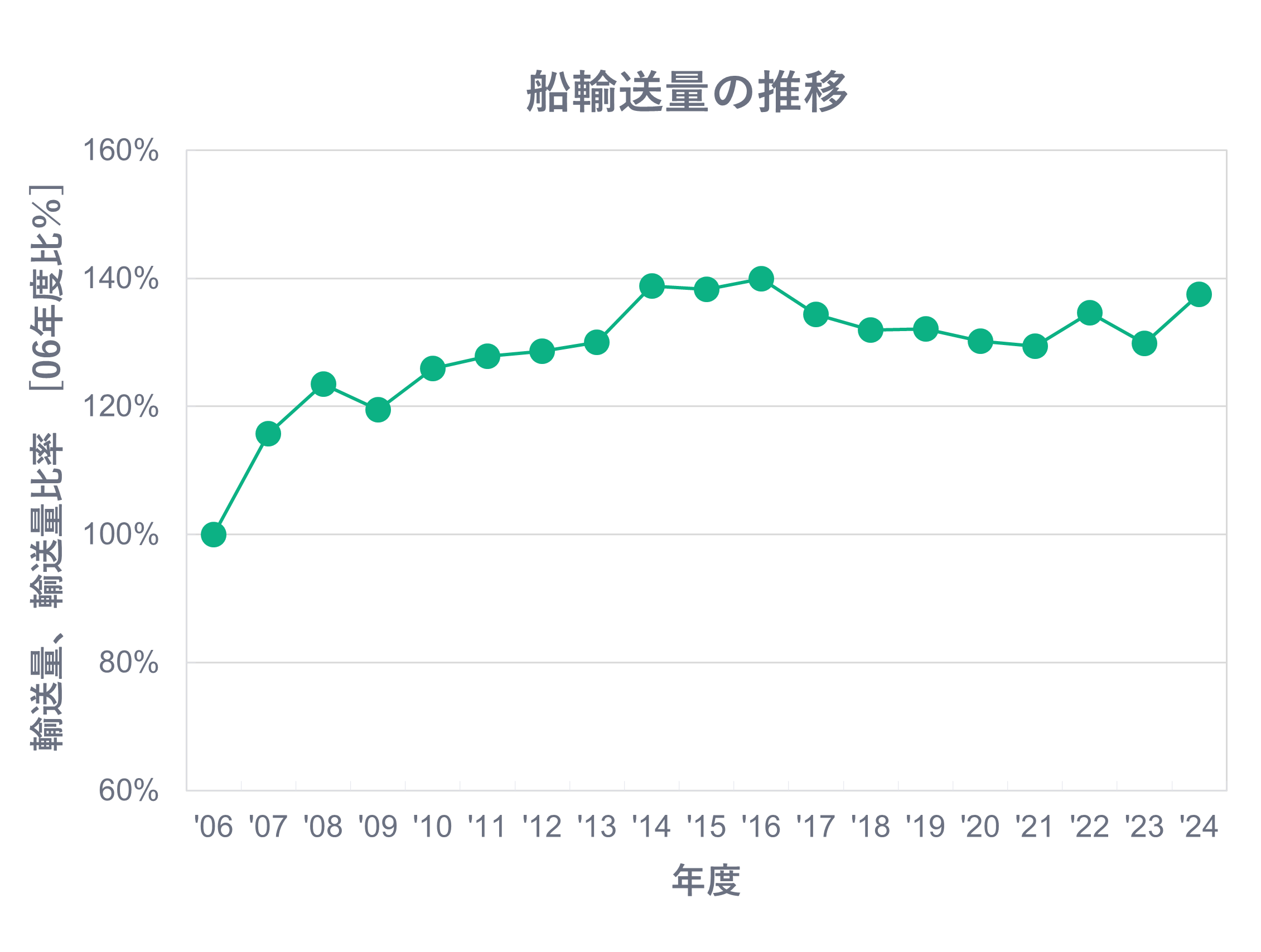 現在、国内専用船4隻を使用し、海上輸送を行っています。この国内専用船の活用を更に進め、トラックによる陸上輸送から海上輸送へモーダルシフト※すべく、取り進めております。 その結果、2023年度の船輸送量は2006年度比約1.4倍まで増加し、CO2削減に寄与しております。
