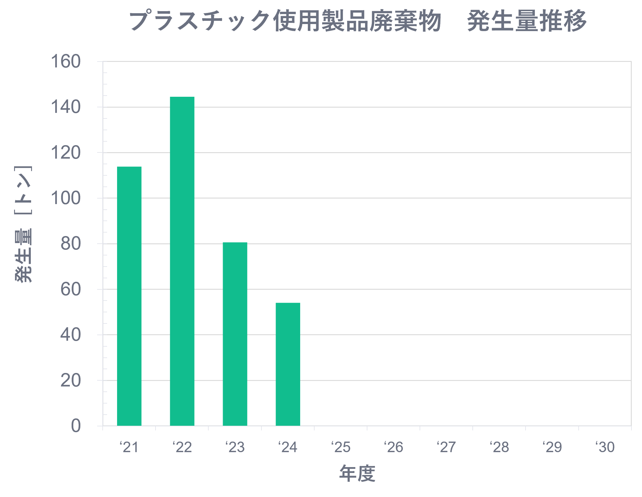 2022年4月より、「プラスチックに係る資源循環の促進等に関する法律」が施行されておりますが、日本ポリエチレンは、工場などで使用されるプラスチック使用製品の廃棄物を法に従い適切に管理しています。2024年度は、屋外保管のフレコンバックに掛けるカバーのリサイクルを進めるなどして、2023年度の比67%になりました。また、原材料として使用されるポリエチレンの「環境に配慮した材料設計」を推進すると共に、お客様の「環境に配慮した製品設計」についても、積極的に支援して参ります。